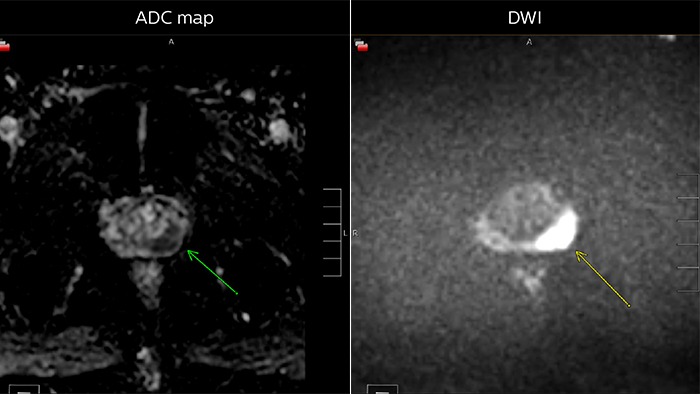“We also look at diffusion-weighted images and the ADC map. Prostate neoplasms generally have diffusion restriction, so they are bright on diffusion-weighted imaging and dark on an ADC map, which is one of the most important characteristics of neoplasms.”