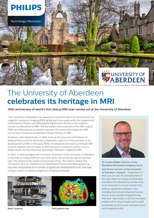 The University of Aberdeen celebrated its 40th anniversary of MRI research and development with a comprehensive upgrade to its Philips 3.0T scanner, including the acquisition of Technology Maximizer, which will support the University through continuous system upgrades, helping them to stay clinically advanced and to remain at the forefront of the latest technology.